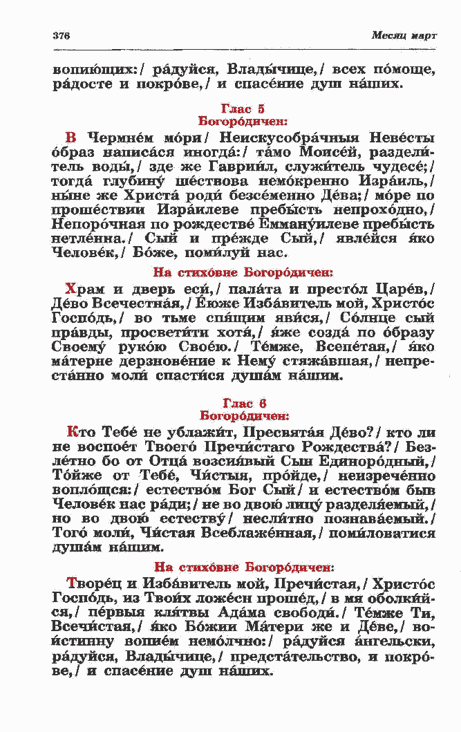 Храм и дверь еси,/ палата и престол Царев,/ Дево Всечестная, / ¬юже Избавитель мой, Христос Господь,/ во тьме спящим явйся,/ Солнце сый правды, просветйти хотя,/ яже созда по образу Своему рукою Своею./ Темже, Всепетая,/ яко матерне дерзновение к Нему стяжавшая,/ непре- станно моли спастися душам нашим. Глас 6