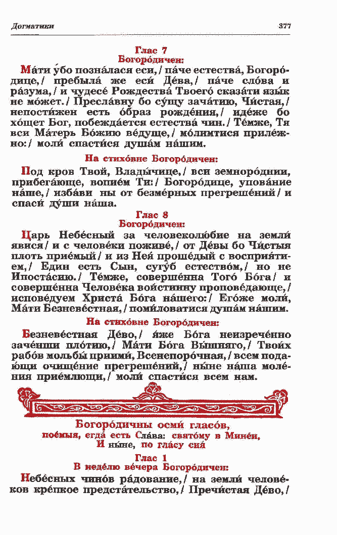 Богородичен: Мати убо позналася еси, / паче естества, Богоро- дице,/ пребыла же еси Дева,/ паче слова и разума, / и чудесе Рождества Твоего сказати язык не может./ Преславну бо сушу зачатию, Чистая,/ непостижен есть образ рождения,/ идеже бо хощет Бог, побеждается естества чин. / Темже, Тя вси Матерь Божию ведуще,/ молимтися прилеж- но:/ моли спастйся душам нашим. На стиховне Богородичен: