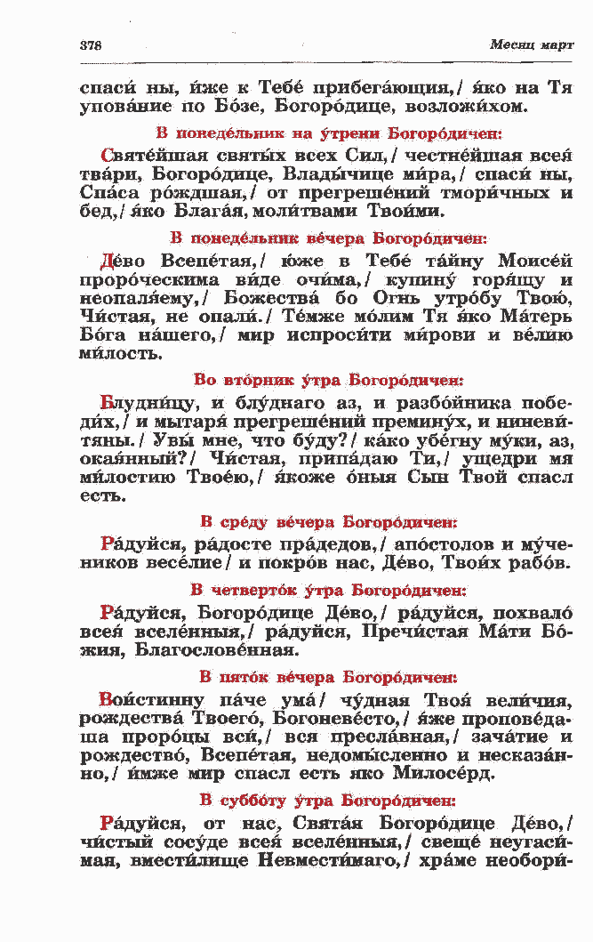 твари, Богородице, Владычице мира,/ спаси ны, Спаса рождшая,/ от прегрешений тморйчных и бед,/ яко Благая, молитвами Твоими. В понедельник вечера Богородичен: