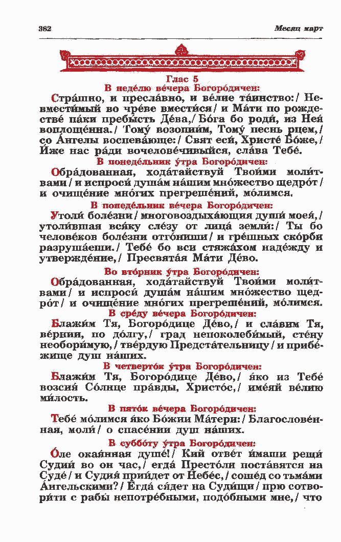 В неделю вечера Богорбдичен: Страшно, и преелавно, и велие таинство:/ Не- вместймый во чреве вместйся/ и Мати по рожде- стве паки пребысть Дева,/Бога бо рода, из Ней воплощенна./ Тому возопийм, Тому песнь рцем,/ со Ангелы воспевающе: / Свят еси, Христе Ббже, / Иже нас ради вочеловечивыйся, слава Тебе. В понедельник утра Богородичен: Обрадованная, ходатайствуй Твоими молит- вами / и испроси душам нашим множество щедрот / и очищение многих прегрешений, молимся. В понедельник вечера Богородичен: