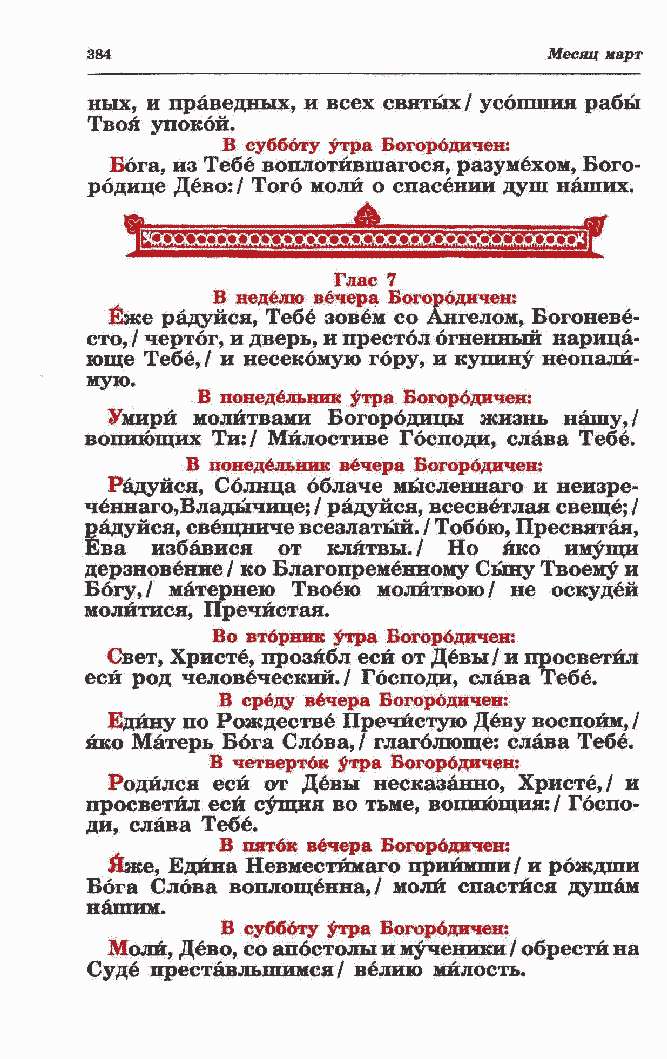 Свет, Христе, прозябл еси от Девы/ и просветил еси род человеческий./ Господи, слава Тебе. В среду вечера Богорбдичен: Едйну по Рождестве Пречистую Деву воспойм, / яко Матерь Бога Слова,/ глаголюще: слава Тебе. В четвертбк утра Богорбдичен: Родился еси от Девы несказанно, Христе,/ и просветил еси сущия во тьме, вопиющия:/ Госпо- ди, слава Тебе. В пятбк вечера Богорбдичен: