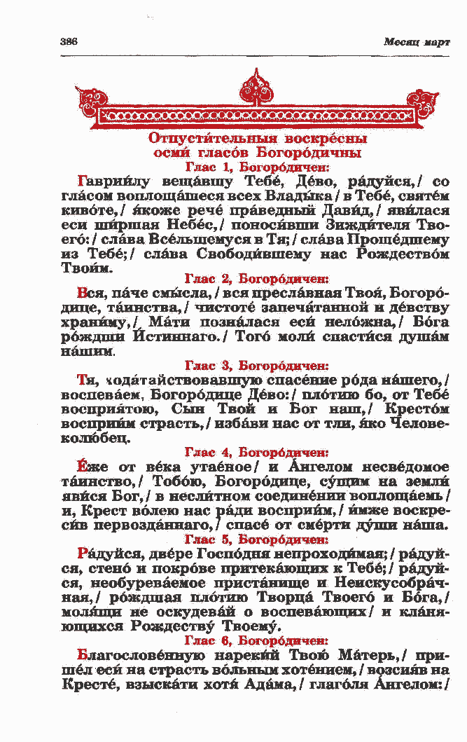 осмй гласбв Богородичны Глас 1, Богорбдичен: Гавриилу вещавшу Тебе, Дево, радуйся,/ со гласом воплощашеся всех Владыка/в Тебе, святем кивоте,/ якоже рече праведный Давид,/ явйлася еси шйршая Небес,/ поносивши Зиждителя Тво- его: / слава Вселыпемуся в Тя; / слава Прошедшему из Тебе;/ слава Свободившему нас Рождеством Твоим.