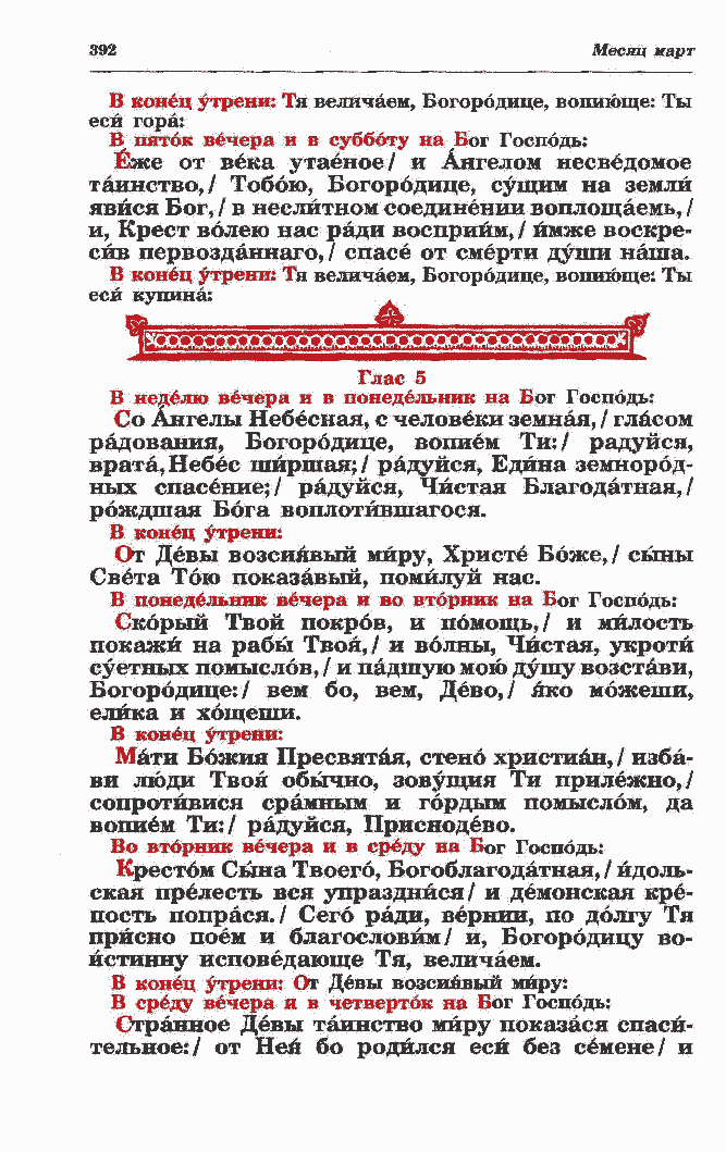 ви люди Твоя обычно, зовущия Ти прилежно,/ сопротйвися срамным и гордым помыслом, да вопием Ти:/ радуйся, Приснодево. Во вторник вечера и в среду на Бог Господь: