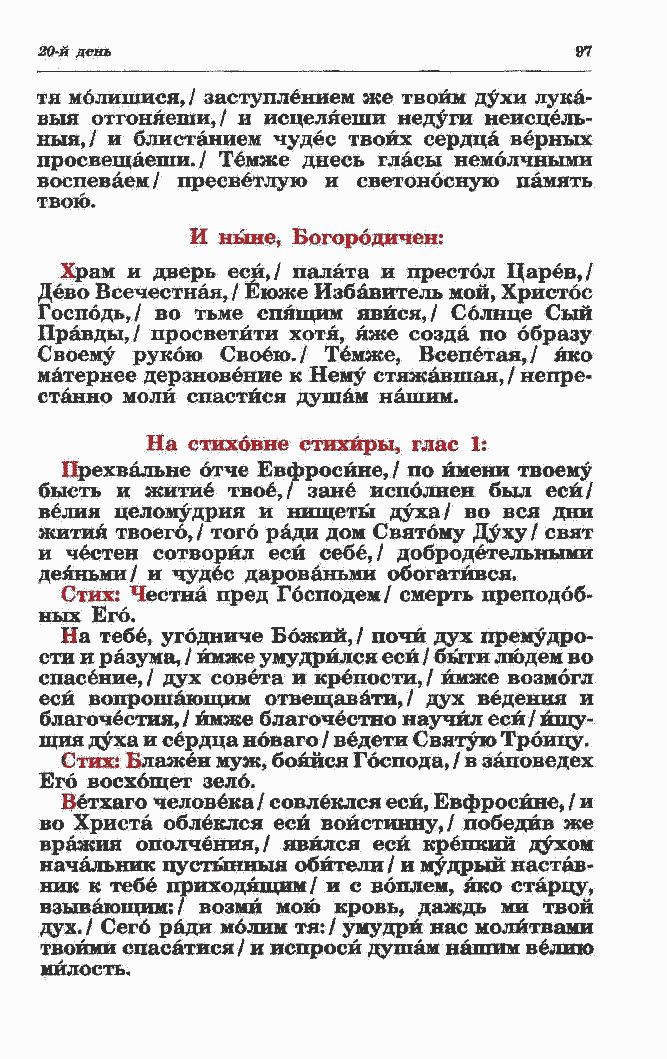 во Христа облеклся еси войстинну,/ победив же вражия ополчения,/ явился еси крепкий духом начальник пустынный обители / и мудрый настав- ник к тебе приходящим/ и с воплем, яко старцу, взывающим:/ возмй мою кровь, даждь ми твой дух. / Сего ради молим тя: / умудри нас молитвами твоими спасатися/ и испроси душам нашим велию милость. |