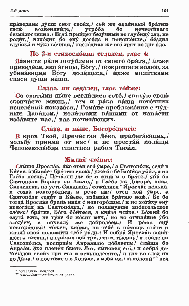 скончаете жизнь,/ тем и рака ваша источник исцелений показася, / Романе преблаженне с чуд- ным Давидом,/ молитвами вашими от напасти избавите нас,/ вас почитающих. Слава, и ныне, Богорбдичен: