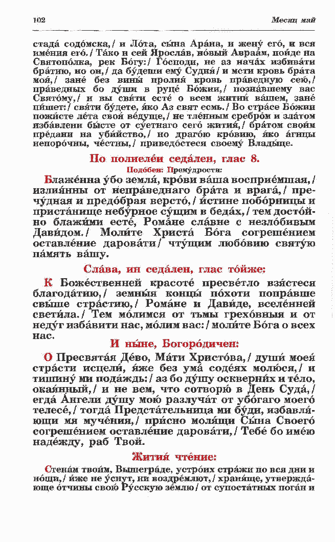 излиянны от неправеднаго брата и врага,/ пре- чудная и предобрая версто, / истине поборницы и пристанище небурное сущим в бедах, / тем достой- но блажйми есте, Романе славне с незлобивым Давидом./ Молите Христа Бога согрешением оставление даровати/ чтущим любовию святую память вашу. Слава, ин седален, глас тойже: