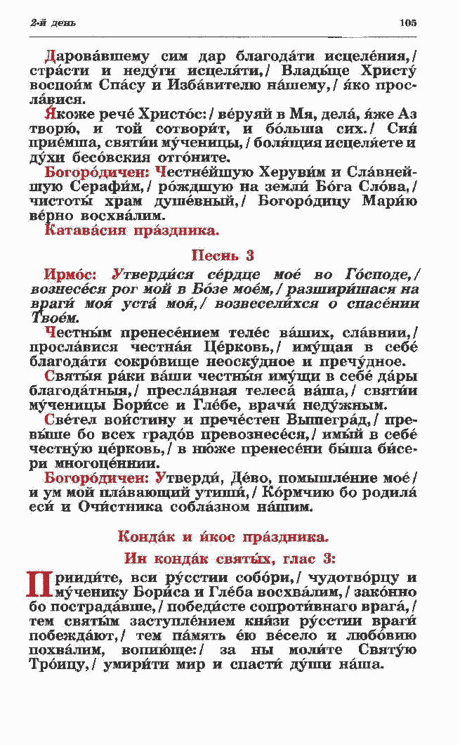 мученику Бориса и Глеба восхвалим, / законно бо пострадавше, / победйсте сопротйвнаго врага, / тем святым заступлением князи русстии враги побеждают,/ тем память ею весело и любовию похвалим, вопиюще:/ за ны молите Святую Троицу,/ умирйти мир и спасти души наша. |