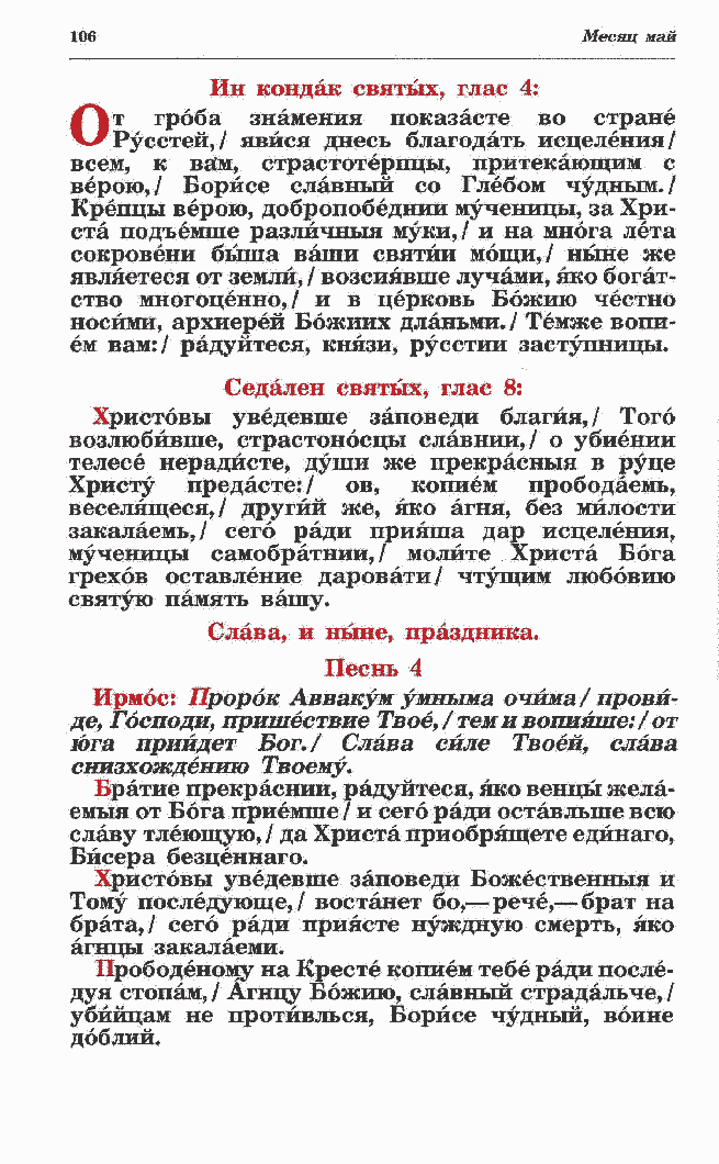 Русстей,/ явйся днесь благодать исцеления/ всем, к вам, страстотерпцы, притекающим с верою,/ Борисе славный со Глебом чудным./ Крепцы верою, добропобеднии мученицы, за Хри- ста подъемше различный муки,/ и на многа лета сокровени быша ваши святйи мощи,/ ныне же являетеся от земли, / возсиявше лучами, яко богат- ство многоценно,/ и в церковь Божию честно носйми, архиерей Божиих дланьми. / Темже вопи- ем вам:/ радуйтеся, князи, русстии заступницы. Седален святых, глас 8: