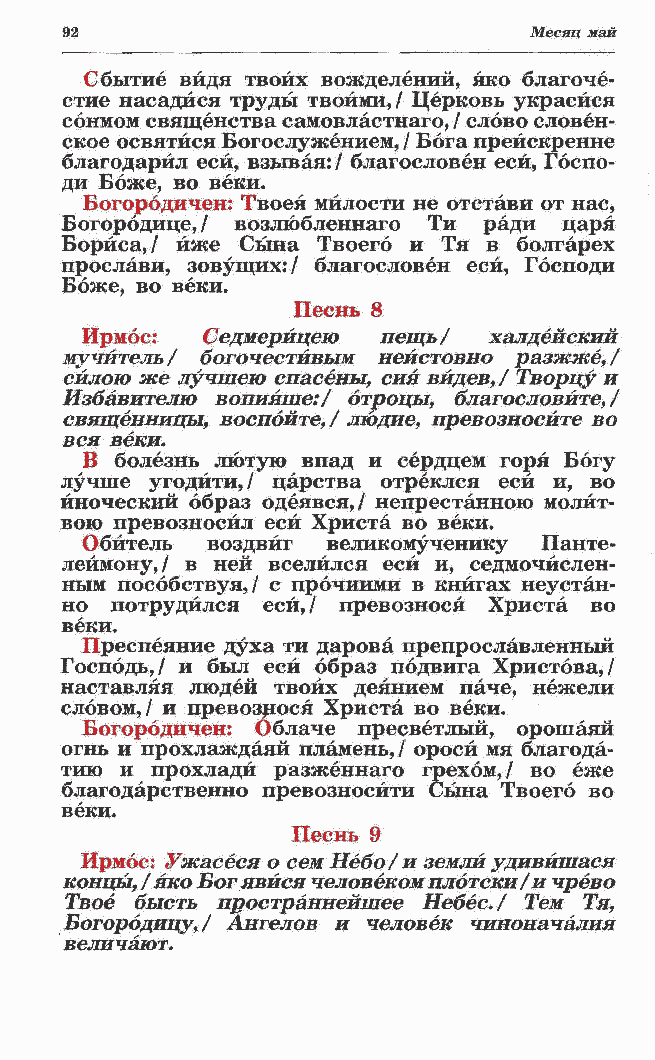 Богородице,/ возлюбленнаго Ти ради царя Бориса,/ йже Сына Твоего и Тя в болгарех прослави, зовущих:/ благословен еси, Господи Боже, во веки. Песнь 8