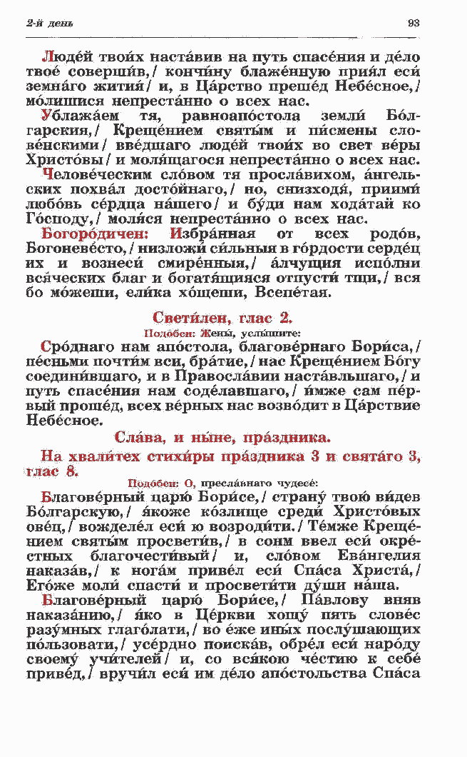 Болгарскую, / якоже козлище среди Христовых овец, / вожделел еси ю возродйти. / Темже Креще- нием святым просветив,/ в сонм ввел еси окре- стных благочестивый/ и, словом Евангелия наказав,/ к ногам привел еси Спаса Христа,/ Егоже моли спасти и просветйти души наша. Благоверный царю Борисе,/ Павлову вняв