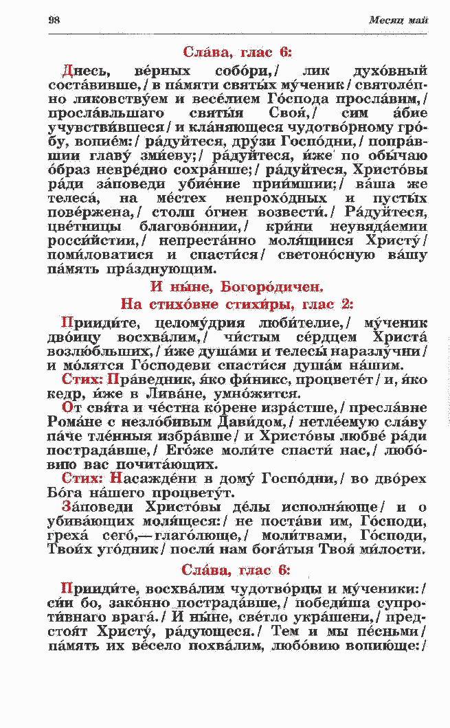 составивше, / в памяти святых мученик / святолеп- но ликовствуем и веселием Господа прославим,/ прославлынаго святыя Своя,/ сим абие учуветвйвшеся / и кланяющеся чудотворному гро- бу, вопием: / радуйтеся, друзи Господни, / поправ- ший главу змйеву;/ радуйтеся, йже по обычаю образ невредно сохранше;/ радуйтеся, Христовы ради заповеди убиение приймшии;/ ваша же телеса, на местех непроходных и пустых повержена,/ столп огнен возвести./ Радуйтеся, цветницы благовоннии, / крйни неувядаемии россййстии,/ непрестанно молящийся Христу/ помйловатися и спастися/ светоносную вашу память празднующим. И ныне, Богородичен.