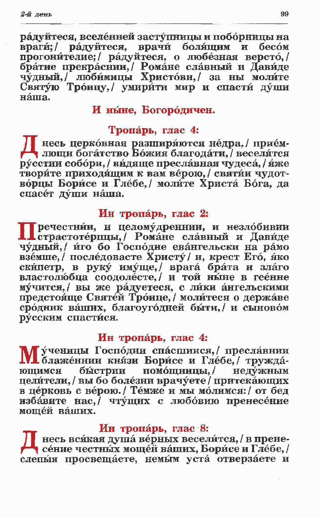 страстотерпцы,/ Романе славный и Давиде чудный,/ йго бо Господне евангельски на рамо вземше,/ последовасте Христу/ и, крест Его, яко скипетр, в руку имуще,/ врага брата и злаго властолюбца соодолесте,/ и той ныне в геенне мучится,/ вы же радуетеся, с лики ангельскими предстояще Святей Троице, / молйтеся о державе сродник ваших, благоугодней быти,/ и сыновом русским спастйся. Ин тропарь, глас 4: