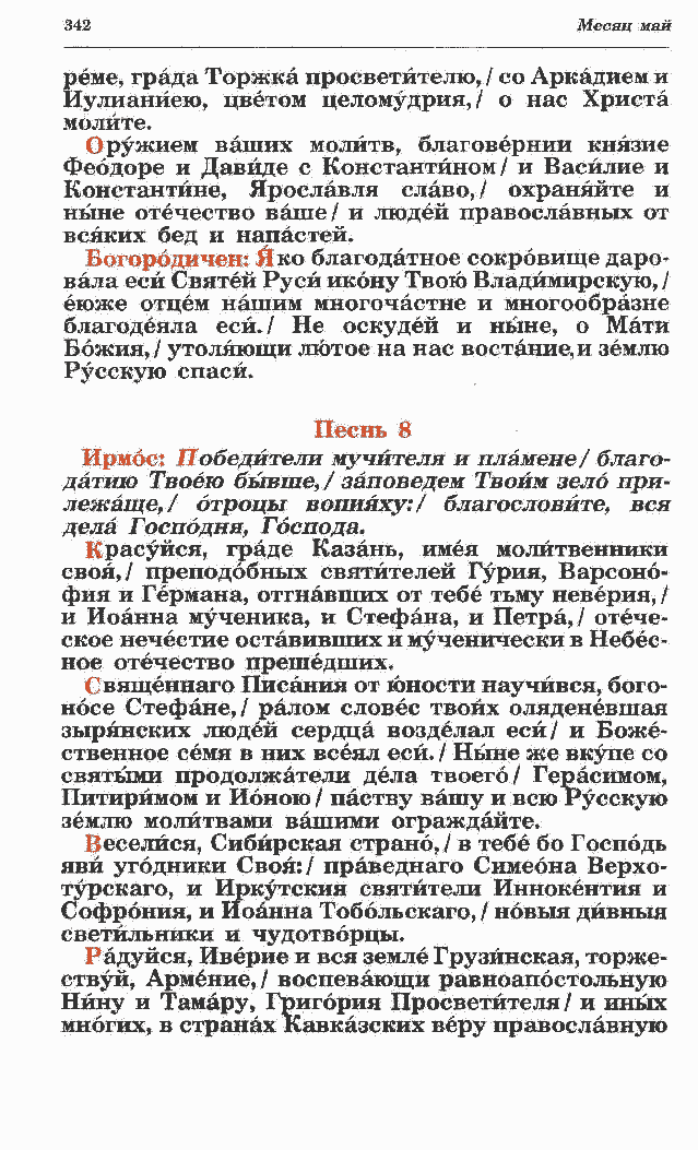 своя,/ преподобных святителей Гурия, Варсоно- фия и Германа, отгнавших от тебе тьму неверия, / и Иоанна мученика, и Стефана, и Петра,/ отече- ское нечестие оставивших и мученически в Небес- ное отечество прешедших. Священнаго Писания от юности научився, бого-