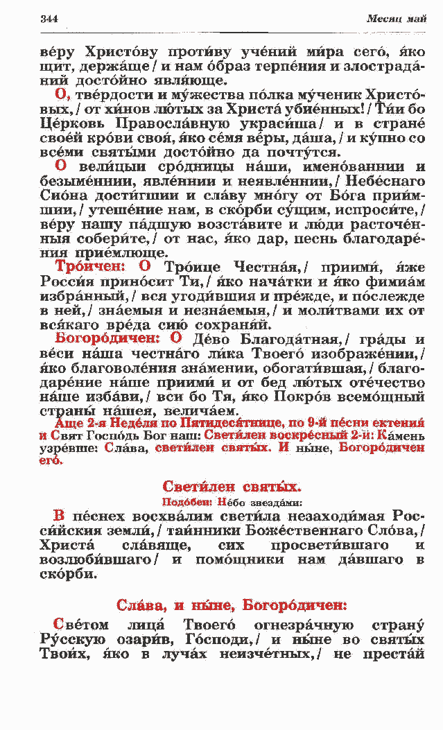 безыменнии, явленнии и неявленнии,/ Небеснаго Сиона достигший и славу многу от Бога прийм- шии, / утешение нам, в скорби сущим, испросите, / веру нашу падшую возставите и люди расточен- ныя соберите,/ от нас, яко дар, песнь благодаре- ния приемлюще. Троичен: О Троице Честная,/ приимй, яже