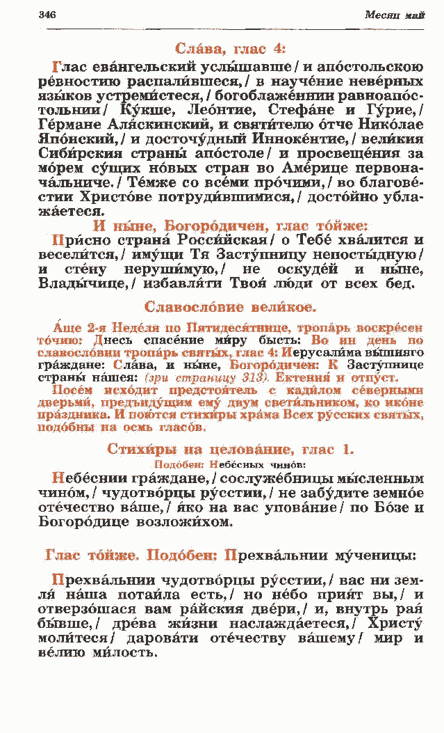 ревностию распалйвшеся, / в научение неверных языков устремйстеся, / богоблаженнии равноапос- тольнии/ Кукше, Леонтие, Стефане и Гурие,/ Германе Аляскинский, и святителю отче Николае Японский, / и досточудный Иннокентие, / велйкия Сибйрския страны апостоле/ и просвещения за морем сущих новых стран во Америце первона- чальниче. / Темже со всеми прочими, / во благове- стии Христове потрудившимися,/ достойно убла- жаетеся. И ныне, Богородичен, глас тойже: