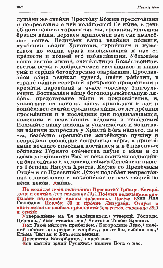 и непрестанно о ней молящийся! Се ныне, в день общаго вашего торжества, мы, грешнии, меньший братия ваши, дерзаем приносйти вам сие хвалеб- ное пение. Величаем ваша велйкия подвиги, духовнии воини Христови, терпением и муже- ством до конца врага низложивший и нас от прелести и козней его избавляющий. Ублажаем ваше святое житие, светйльницы Божественнии, светом веры и добродетелей светящийся и наша умы и сердца богомудренно озаряющий. Прослав- ляем ваша великая чудеса, цвети райстии, в стране нашей северней прекрасне процветший и ароматы дарований и чудес повсюду благоуха- ющий. Восхваляем вашу богоподражательную лю- бовь, предстателие наши и покровйтелие, и, уповающе на помощь вашу, припадаем к вам и вопием: в си святйи сродницы наши, от лет древних просиявший и в последния дни подвизавшийся, явленнии и неявленнии, ведомии и неведомии! Помяните нашу немощь и уничижение и молитва- ми вашими испросите у Христа Бога нашего, да и мы, безбедно преплывше житейскую пучину и невредимо соблюдите сокровище веры, в приста- нище вечнаго спасения достигнем и в блаженных обйтелех Горняго отечества вк^пе с вами и со всеми угодившими Ему от века святыми водворим- ся благодатию и человеколюбием Спасителя наше- го Господа Иисуса Христа, Емуже со Превечным Отцем и со Пресвятым Духом подобает непрестан- ное славословие и поклонение от всех тварей во веки веков. Аминь. По молитве поем величания Пресвятей Троице, Богоро-