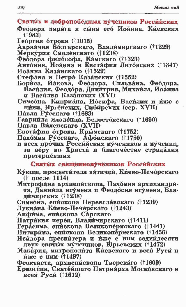 Митрофана архиепископа, Пахомия архимандри- та, Даниила игумена и Феодосия игумена, Вла- димирских (11238) Симеона, епископа Переяславскаго (+1239) Лукиана Кйево-Печерскаго (11243) Анфйма, епископа Сарскаго Патрйкия иерея, Владймирскаго (11411) Герасима, епископа Великопермскаго (11441) Питирйма, епископа Великопермскаго (11456) Исидора пресвитера и йэке с ним седмидесяти двух святых мучеников, Юрьевских (+1472)