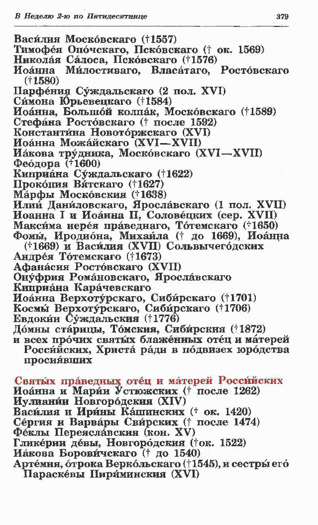 Космы Верхотурскаго, Сибйрскаго (+1706) Бвдокйи Суждальския (+1776) Домны старицы, Томския, Сибйрския (+1872) и всех прочих святых блаженных отец и матерей Российских, Христа ради в подвизех юродства