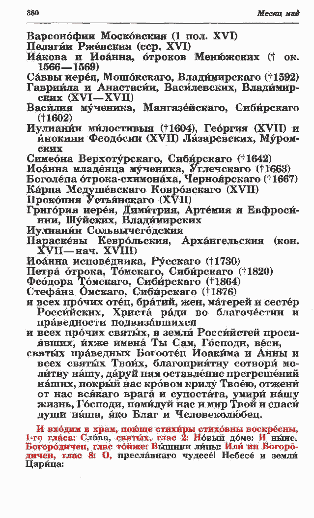 Иоанна исповедника, Русскаго (1*1730) Петра отрока, Томскаго, Сибйрскаго (1*1820) Феодора Томскаго, Сибйрскаго (1*1864) Стефана бмскаго, Сибйрскаго (+1876) и всех прочих отец, братии, жен, матерей и сестер Российских, Христа ради во благочестии и праведности подвизавшихся и всех прочих святых, в земли Россййстей проси- явших, йхже имена Ты Сам, Господи, веси, святых праведных Богоотец Иоакйма и Анны и всех святых Твоих, благоприятну сотвори мо- литву нашу, даруй нам оставление прегрешений наших, покрый нас кровом крилу Твоею, отженй от нас всякаго врага и супостата, умирй нашу жизнь, Господи, помилуй нас и мир Твой и спаси души наша, яко Благ и Человеколюбец. И входим в храм, поюще стихиры стиховны воскресны,