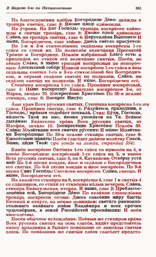 гласа. Прокимен святых^ глас 4: Радуйтеся, праведнии, о Господе, / правым подобает похвала. Стих: Буди, Господи, милость Твоя на нас, якоже уповахом на Тя. Всякое дыхание: Евангелие храма Всех русских святых, от Матфея, зачало 10. Воскресение Христово: Псалом 50. Слава: Молитвами всех святых русских: И ныне: Молитва- ми Богородицы: По 50-м псалме стихира святых, глас 6: Ежелетнюю память: Посем глаголет диакон молитву Спаси, Боже, люди Твоя: (зри устав на литии, страница 354). Канон воскресен Октоиха 1-го гласа со ирмосом на 4, и