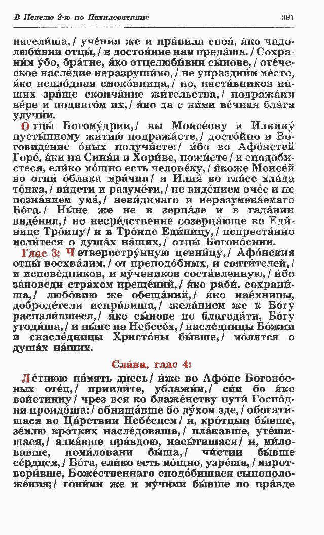 пустынному житию подражаете,/ достойно и Бо- говидение оных получйсте:/ ибо во Афонстей Горе, аки на Синаи и Хорйве, пожйсте / и сподоби- стеся, елико мощно есть человеку, / якоже Моисей во огни облака мрачна/ и Илия во гласе хлада тонка, / вйдети и разумети, / не видением очес и не познанием ума,/ невйдимаго и неразумеваемаго Бога./ Ныне же не в зерцале и в гадании видения,/ но несредственне созерцающе во Еди- нице Троицу /ив Троице Единицу, / непрестанно молйтеся о душах наших,/ отцы Богоноснии. Глас 3: Четверострунную цевницу,/ Афонския