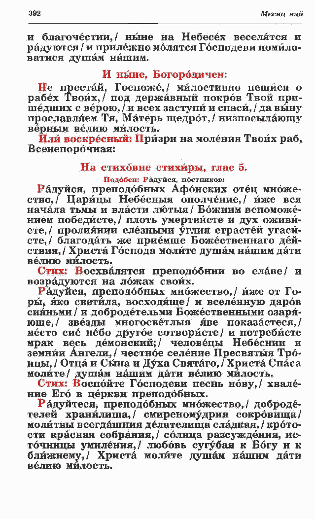 ство,/ Царицы Небесныя ополчение,/ йже вся начала тьмы и власти лютыя/ Божиим вспоможе- нием победйсте,/ плоть умертвйсте и дух оживй- сте,/ пролиянии слезными углия страстей угасн- ете,/ благодать же приемше Божественнаго дей- ствия, / Христа Господа молите душам нашим дати велию милость. Стих: Восхвалятся преподобнии во славе/ и