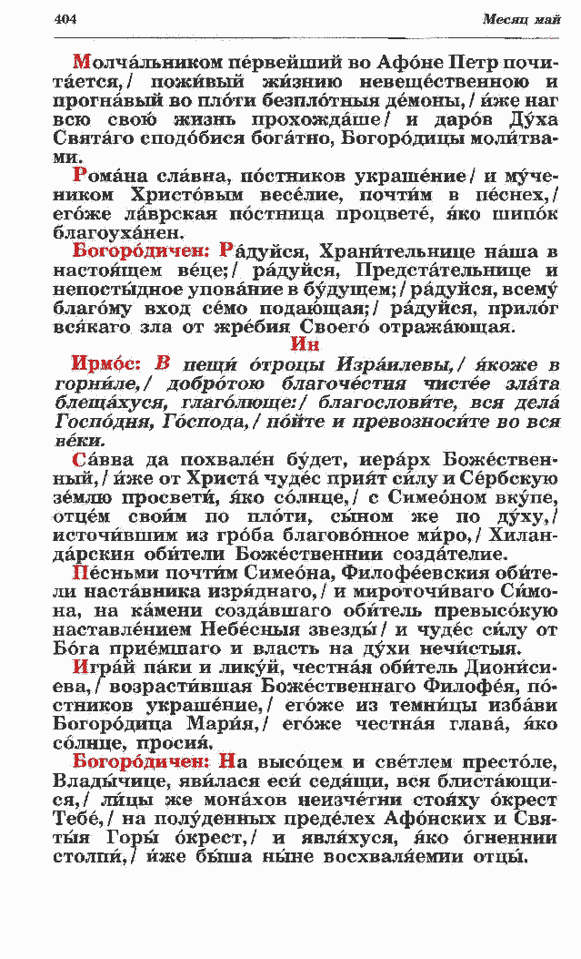 ный, / йже от Христа чудес прият силу и Сербскую землю просвети, яко солнце,/ с Симеоном вкупе, отцем своим по плоти, сыном же по духу,/ источившим из гроба благовонное мйро, / Хилан- дарския обители Божественнии создателие. Песньми почтим Симеона, Филофеевския обите-