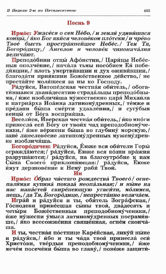 концы, / яко Бог явйся человеком плотски/и чрево Твое бысть пространнейшее Небес/ Тем Тя, Богородицу,/ Ангелов и человек чиноначалия величают. Преподобнии отцы Афонстии,/ Царицы Небес-