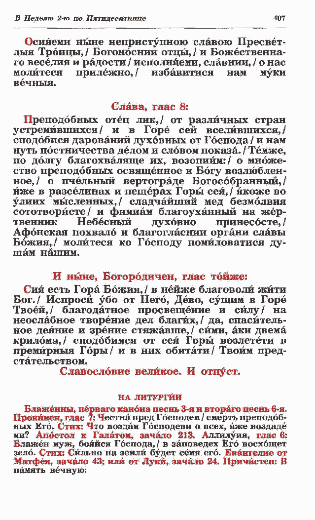 устремившихся/ и в Горе сей вселившихся,/ сподобися дарований духовных от Господа/ и нам путь постничества делом и словом показа. / Темже, по долгу благохваляще их, возопийм:/ о множе- ство преподобных освященное и Богу возлюблен- ное,/ о пчельный вертограде Богособранный, / йже в разселинах и пещерах Горы сея, / якоже во улиих мысленных,/ сладчайший мед безмолвия сототворйсте / и фимиам благоуханный на жер- твенник Небесный духовно принесосте,/ Афонская похвало и благогласнии органи славы Божия,/ молйтеся ко Господу помйловатися ду- шам нашим. И ныне, Богородичен, глас тойже: