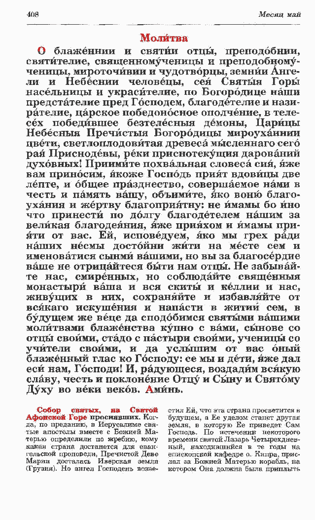 святйтелие, священномученицы и преподобному- ченицы, мироточйвии и чудотворцы, земнйи Анге- ли и Небеснии человецы, сея Святыя Горы насельницы и украсйтелие, по Богородице наши предстателие пред Господем, благодетелие и нази- рателие, царское победоносное ополчение, в теле- сех победившее безтелесныя демоны, Царицы Небесныя Пречйстыя Богородицы мироуханнии цвети, светлоплодовйтая древеса мысленнаго сего рая Приснодевы, реки приснотекущия дарований духовных! Приимйте похвальная словеса сия, яже вам приносим, якоже Господь прият вдовицы две лепте, и общее празднество, совершаемое нами в честь и память вашу, объимйте, яко воню благо- ухания и жертву благоприятну: не имамы бо йно что принести по долгу благодетелем нашим за великая благодеяния, яже прияхом и имамы при- йти от вас. Ей, исповедуем, яко мы грех ради наших несмы достойни жйти на месте сем и именоватися сынмй вашими, но вы за благосердие ваше не отрицайтеся быти нам отцы. Не забывай- те нас, смиренных, но соблюдайте священныя монастыри ваша и вся скиты и келлии и нас, живущих в них, сохраняйте и избавляйте от всякаго искушения и напасти в житий сем, в будущем же веце да сподобимся святыми вашими молитвами блаженства купно с вами, сынове со отцы своими, стадо с пастыри своими, ученицы со учители своими, и да услышим от вас оный блаженный глас ко Господу: се мы и дети, яже дал еси нам, Господи! И, радующеся, воздадим всякую славу, честь и поклонение Отцу и Сыну и Святому Духу во веки веков. Амйнь. Собор святых, на Святой стил Ей, что эта страна просветится в