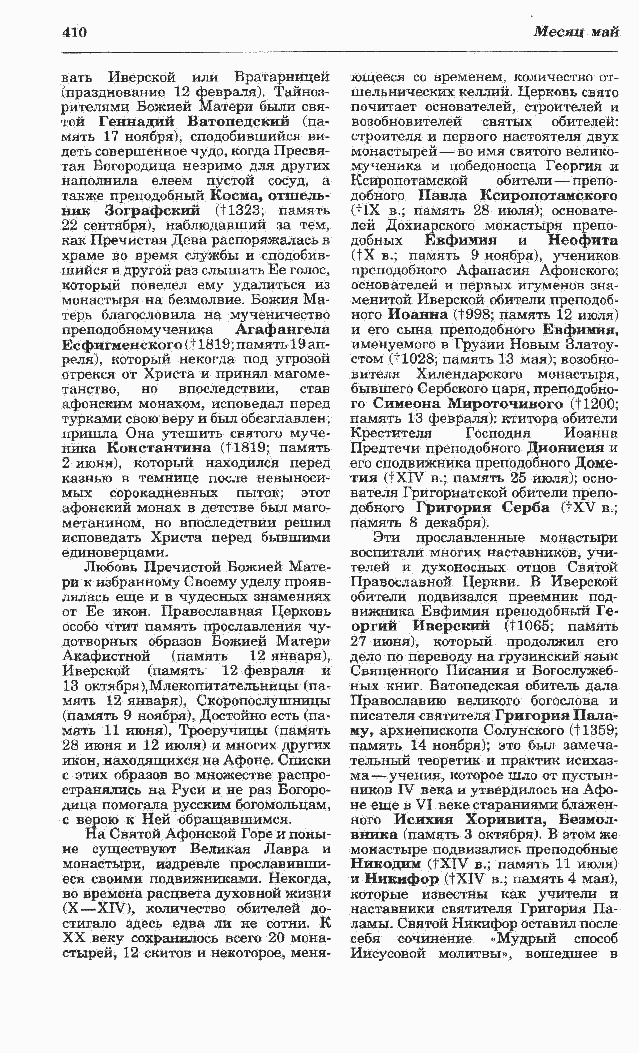 (празднование 12 февраля). Тайноз- рителями Божией Матери были свя- той Геннадий Ватопедский (па- мять 17 ноября), сподобившийся ви- деть совершенное чудо, когда Пресвя- тая Богородица незримо для других наполнила елеем пустой сосуд, а также преподобный Косма, отшель- ник Зографский (1*1323; память 22 сентября), наблюдавший за тем, как Пречистая Дева распоряжалась в храме во время службы и сподобив- шийся в другой раз слышать Ее голос, который повелел ему удалиться из монастыря на безмолвие. Божия Ма- терь благословила на мученичество преподобномученика Агафангела Есфигменского(1"1819; память 19 ап- реля), который некогда под угрозой отрекся от Христа и принял магоме- танство, но впоследствии, став афонским монахом, исповедал перед турками свою веру и был обезглавлен; пришла Она утешить святого муче- ника Константина (11810; память 2 июня), который находился перед казнью в темнице после невыноси- мых сорокадневных пыток; этот афонский монах в детстве был маго- метанином, но впоследствии решил исповедать Христа перед бывшими единоверцами. Любовь Пречистой Божией Мате-