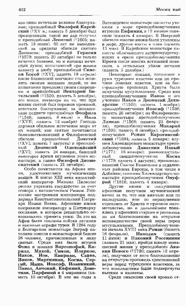 пили в море преподобномученика игумена Бвфимия, а 12 иноков пове- сили (память 4 января). В Иверской обители многие иноки были утоплены в море, другие взяты в плен (память 13 мая). В Карейском монастыре па- писты обличавшего латиномудрству- ющих в ереси преподобномученика Прота после многих истязаний пове- сили, а остальных убили мечами (память 5 декабря.) Некоторые монахи, попавшие в