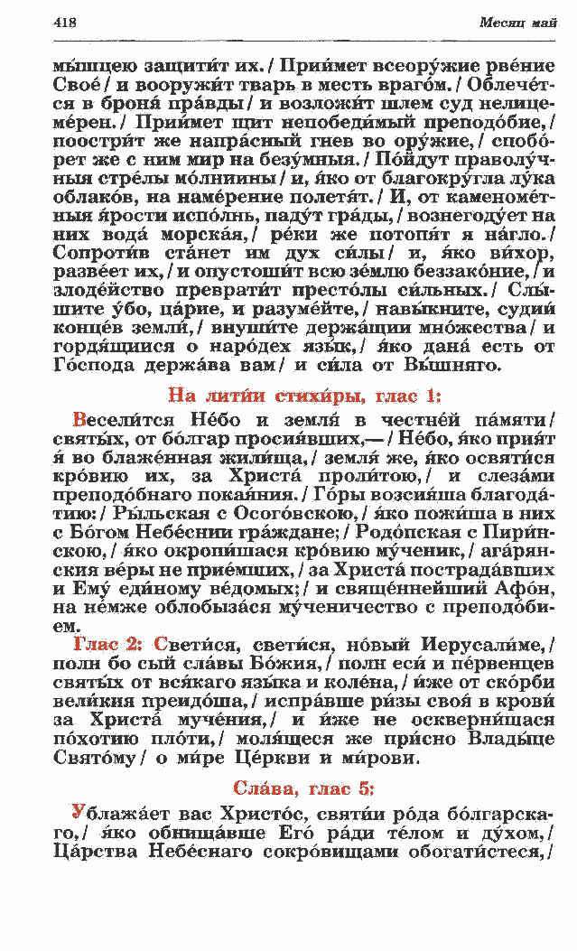 святых, от болгар просиявших,? / Небо, яко прият я во блаженная жилища, / земля же, яко освятйся кровию их, за Христа пролитою,/ и слезами преподобнаго покаяния. / Горы возсияша благода- тию: / Рыльская с Осоговскою, / яко пожйша в них с Богом Небеснии граждане; / Родопская с Пирйн- скою, / яко окропйшася кровию мученик, / агарян- ския веры не приемших, / за Христа пострадавших и Ему единому ведомых; / и священнейший Афон, на немже облобызася мученичество с преподоби- ем. Глас 2: Светйся, светйся, новый Иерусалиме,/
