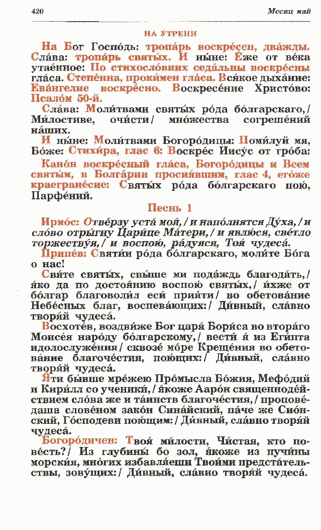 слово отрыгну Царице Матери, / и явлюся, светло торжествуя,/ и воспою, радуяся, Тоя чудеса. Припев: Святйи рода болгарскаго, молите Бога