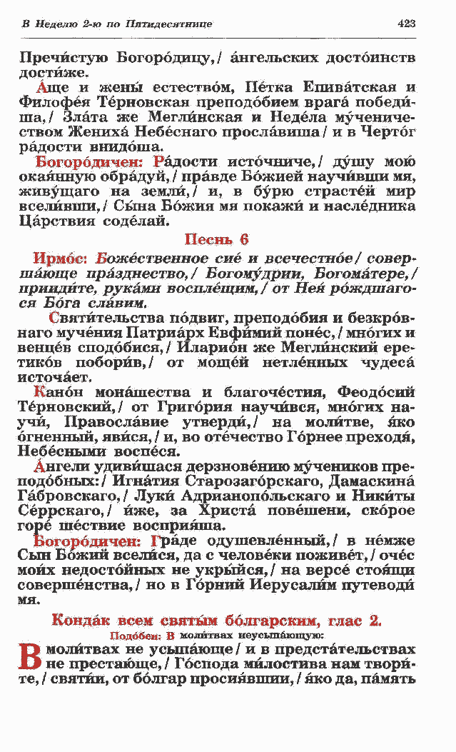 Сын Божий вселйся, да с человеки поживет, / очес моих недостойных не укрыйся,/ на версе стоящи совершенства, / но в Горний Иерусалим путеводй мя. Кондак всем святым болгарским, глас 2.