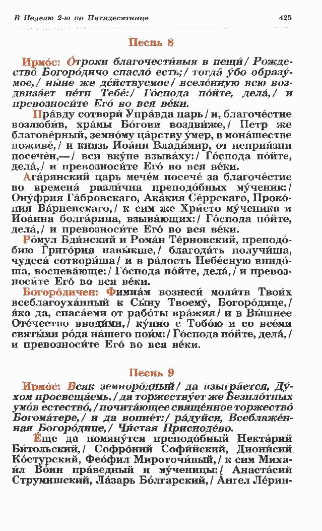 всеблагоуханный к Сыну Твоему, Богородице,/ яко да, спасаеми от работы вражия/ и в Вышнее Отечество вводйми,/ купно с Тобою и со всеми святыми рода нашего пойм: / Господа пойте, дела, / и превозносите Его во вся веки. Песнь 9