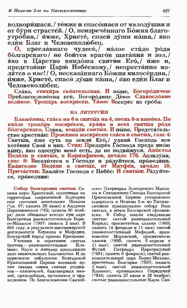 входе тропарь воскресен, храма и всех святых рода болгарскаго. Слава, кондак святых. И ныне, Предстатель- ство христиан: Прокимен воскресен гласа и святых, глас 4: Святым, йже суть на земли Его,/ удиви Господь вся хотения Своя в них. Стих: Предзрех Господа предо мною выну, яко одесную мене есть, да не лодвйжуся. Апостол Недели и святых, к Корйнфяном, зачало 176. Аллилуйя, глас 8: Веселйтеся о Господе и радуйтеся, праведнии. Евангелие Недели и святых, от Матфея, зачало 10. Причастен: Хвалите Господа с Небес: И святым: Радуйте- ся, праведнии: |
