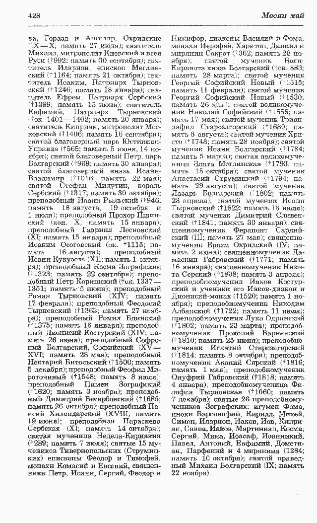 (IX ? X; память 27 июля); святитель Михаил, митрополит Киевский и всея Руси (+992; память 30 сентября); свя- титель Иларион, епископ Меглин- ский (+1164; память 21 октября); свя- титель Иоаким, Патриарх Тырнов- ский (+1246; память 18 января); свя- титель Ефрем, Патриарх Сербский (+1399; память 15 июня); святитель Евфимий, Патриарх Тырновский (+ок. 1401?1402; память 20 января); святитель Киприан, митрополит Мос- ковский (+1406; память 16 сентября); святой благоверный царь Юстиниан- Управда (+565; память 5 июня, 14 но- ября); святой благоверный Петр, царь Болгарский (+969; память 30 января); святой благоверный князь Иоанн- Владимир ( + 1016; память 22 мая); святой Стефан Милутин, король Сербский ( + 1317; память 30 октября); преподобный Иоанн Рыльский (+946; память 18 августа, 19 октября и 1 июля); преподобный Прохор Пшин- ский (кон. X; память 15 января); преподобный Гавриил Лесновский (XI; память 15 января); преподобный Иоаким Осоговский (ок. +1115; па- мять 16 августа); преподобный Иоанн Кукузель (XII; память 1 октяб- ря); преподобный Косма Зографский (+1323; память 22 сентября); препо- добный Петр Коришский (+ок. 1337 ? 1351; память- 5 июня); преподобный Роман Тырновский (XIV; память 17 февраля); преподобный Феодосии Тырновский ( + 1363; память 27 нояб- ря); преподобный Ромил Бдинский (+1375; память 16 января); преподоб- ный Дионисий Костурский (XIV; па- мять 26 июня); преподобный Софро- ний Болгарский, Софийский (XV ? XVI; память 28 мая); преподобный Нектарий Битольский (+1500; память 5 декабря); преподобный Феофил Ми- роточивый (+1548; память 8 июля); преподобный Пимен Зографский (+1620; память 3 ноября); преподоб- ный Димитрий Бесарбовский (+1685; память 26 октября); преподобный Па- исий Хилендарский (XVIII; память 19 июня); преподобная Параскева Сербская (XI; память 14 октября); святая мученица Недела-Кириакия (+289; память 7 июля); святые 15 му- чеников Тивериопольских (Струмиц- ких) епископы Феодор и Тимофей, монахи Комасий и Евсевий, священ- ники Петр, Иоанн, Сергий, Феодор и |