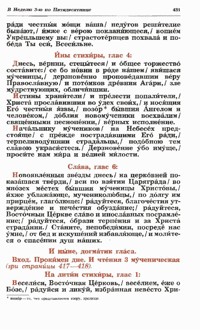 Христа прославившия во удех своих, / и носящия Его честныя язвы,/ позор* бывшия Ангелом и человеком,/ доблия новомученики восхвалим/ священными песнопении,/ верных исполнение. Начальнику мучеников/ на Небесех пред-