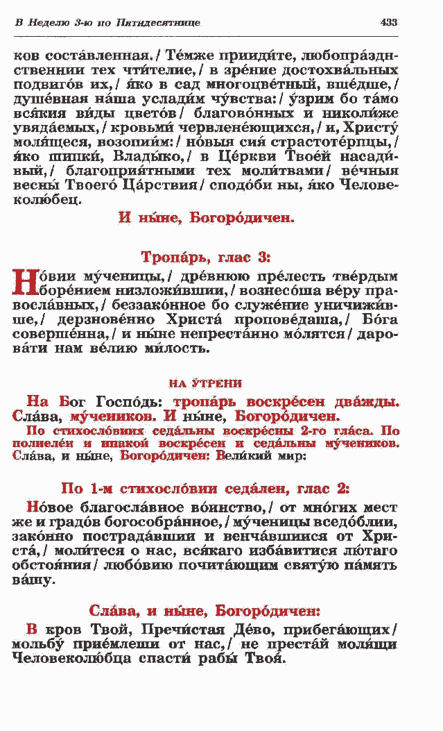 ственнии тех чтйтелие,/ в зрение достохвальных подвигов их,/ яко в сад многоцветный, вшедше,/ душевная наша усладим чувства:/ узрим бо тамо всякий виды цветов/ благовонных и николйже увядаемых, / кровьмй червленеющихся, / и, Христу молящеся, возопийм: / новыя сия страстотерпцы, / яко шипкй, Владыко,/ в Церкви Твоей насадй- вый,/ благоприятными тех молитвами/ вечныя весны Твоего Царствия/ сподоби ны, яко Челове- колюбец. И ныне, Богородичен.