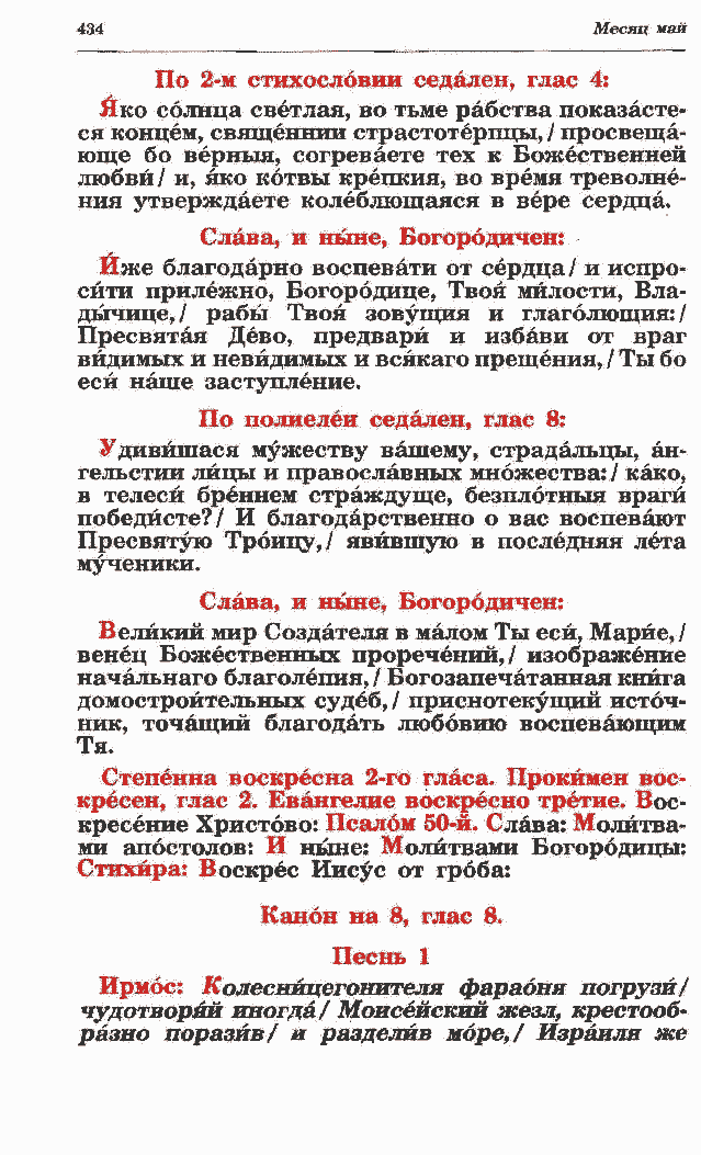 венец Божественных проречений,/ изображение начальнаго благолепия, / Богозапечатанная книга домостроительных судеб, / приснотекущий источ- ник, точащий благодать любовию воспевающим Тя. Степенна воскресна 2-го гласа. Прокимен вос-