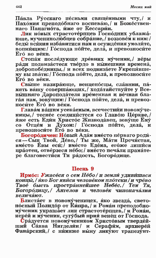 мять вашу совершающих,/ ходатайствуйте у Все- вышняго Дароподателя временная и вечная бла- гая нам, зовущим: / Господа пойте, дела, и превоз- носите Его во веки. Главам вашим усекаемым, всечестнйи новомуче-