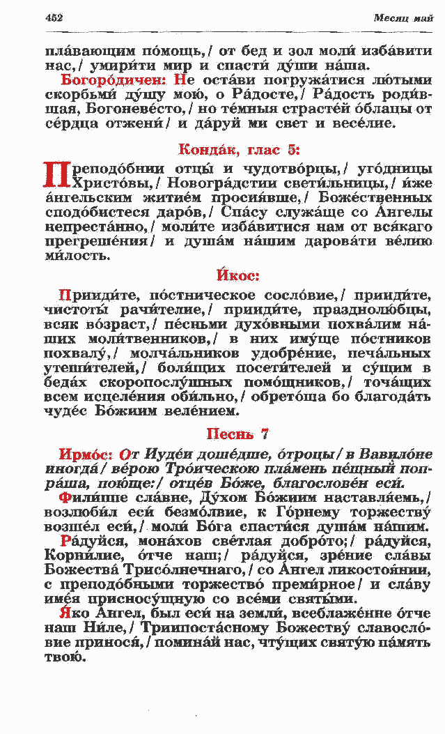 чистоты рачйтелие,/ приидйте, празднолюбцы, всяк возраст,/ песньми духовными похвалим на- ших молитвенников,/ в них имуще постников похвалу,/ молчальников удобрение, печальных утешителей,/ болящих посетителей и сущим в бедах скоропослушных помощников,/ точащих всем исцеления обильно,/ обретоша бо благодать чудес Божиим велением. Песнь 7