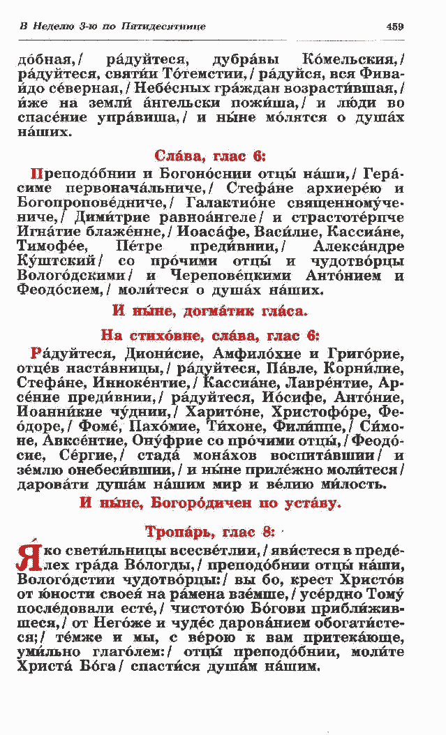 симе первоначалышче, / Стефане архиерею и Богопроповедниче, / Галактионе священномуче- ниче,/ Димйтрие равноангеле/ и страстотерпче Игнатие блаженне, / Иоасафе, Васйлие, Кассиане, Тимофее, Петре предйвнии,/ Александре Куштский/ со прочими отцы и чудотворцы Вологодскими/ и Череповецкими Антонием и Феодосией,/ молитеся о душах наших. И ныне, догматик гласа.