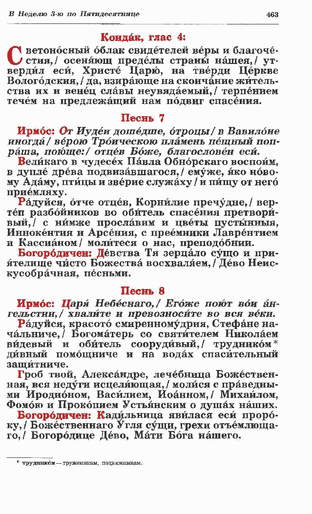 стия,/ осеняющ пределы страны нашея,/ ут- вердил еси, Христе Царю, на тверди Церкве Вологодский, / да, взирающе на скончание житель- ства их и венец славы неувядаемый,/ терпением течем на предлежащий нам подвиг спасения. Песнь 7