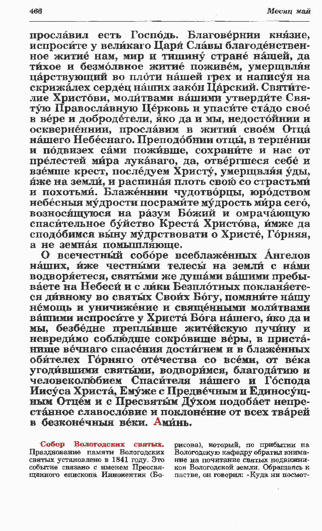 наших, йже честными телесы на земли с нами водворяетеся, святыми же душами вашими пребы- ваете на Небесй и с лики Безплбтных покланяете- ся дивному во святых Своих Богу, помяните нашу немощь и уничижение и священными молитвами вашими испросите у Христа Бога нашего, яко да и мы, безбедне преплывше житейскую пучину и невредимо соблюдше сокровище веры, в приста- нище вечнаго спасения достигнем и в блаженных обйтелех Горняго отечества со всеми, от века угодившими святыми, водворимся, благодатию и человеколюбием Спасителя нашего и Господа Иисуса Христа, Емуже с Предвечным и Единосущ- ным Отцем и с Пресвятым Духом подобает непре- станное славословие и поклонение от всех тварей в безконечныя веки. Аминь. Собор Вологодских святых, рисова), который, по прибытии на