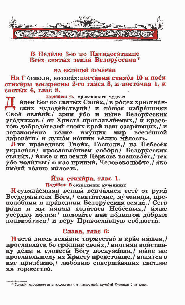 Вседержителя Бога,/ святйтелие, мученицы, пре- подобнии и праведнии Белорусския земли. / Сего ради и мы имамы ходатаев Небесных,/ йхже усердно молим:/ помозйте нам подвигом добрым подвизатися/ и веру Православную соблюсти. Слава, глас 6: