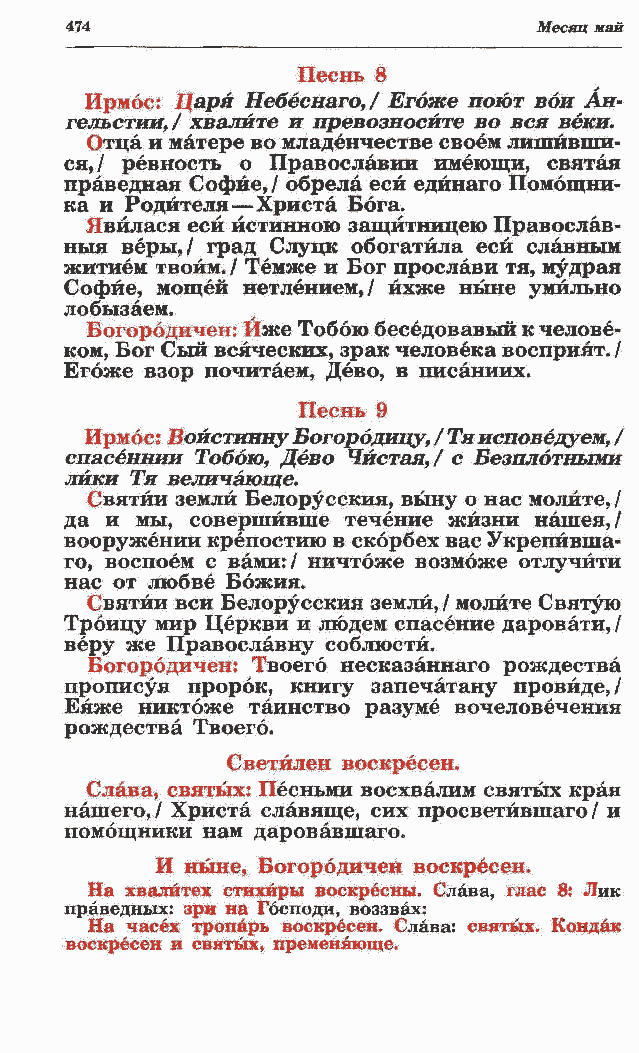 да и мы, совершйвше течение жизни нашея,/ вооружении крепостию в скорбех вас Укрепйвша- го, воспоем с вами:/ ничтоже возможе отлучйти нас от любве Божия. Святйи вси Белорусския земли, / молите Святую
