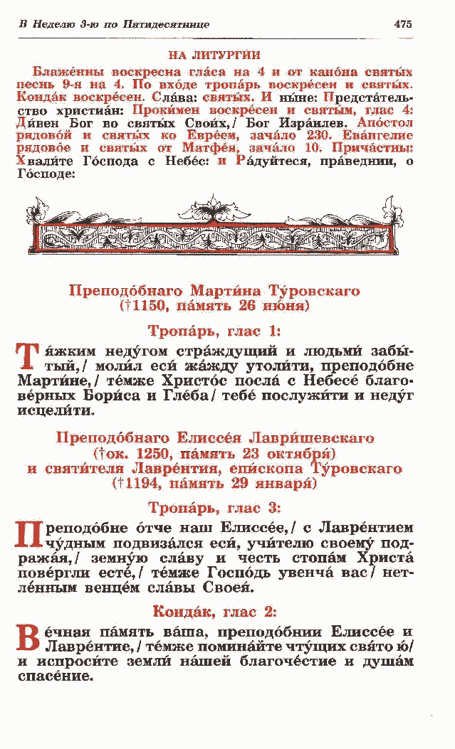 тый,/ молил еси жажду утолйти, преподобие Мартине,/ темже Христос посла с Небесе благо- верных Бориса и Глеба/ тебе послужити и недуг исцелйти. Преподобнаго Елиссея Лаврйшевскаго