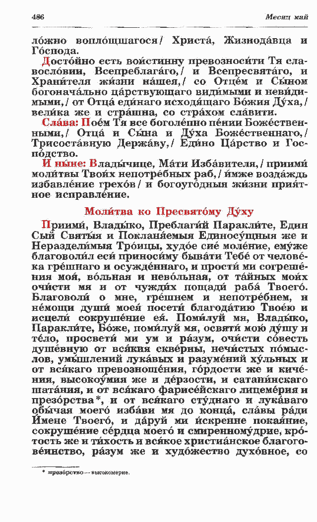 Сый Святыя и Покланяемыя Единоеущныя же и Неразделимый Троицы, худое сие моление, емуже благоволил еси приносйму бывати Тебе от челове- ка грешнаго и осужденнаго, и прости ми согреше- ния моя, вольная и невольная, от тайных моих очисти мя и от чуждйх пощади раба Твоего. Благоволи о мне, грешнем и непотребнем, и немощи души моея посети благодатию Твоею и исцели сокрушение ея. Помилуй мя, Владыко, Параклите, Боже, помилуй мя, освяти мою душу и тело, просвети ми ум и разум, очисти совесть душевную от всякия скверны, нечистых помыс- лов, умышленной лукавых и разумений хульных и от всякаго превозношения, гордости же и киче- ния, высокоумна же и дерзости, и сатанйнскаго шатания, и от всякаго фарисейскаго лицемерия и презорства*, и от всякаго студнаго и лукаваго обычая моего избави мя до конца, славы ради Ймене Твоего, и даруй ми искренне покаяние, сокрушение сердца моего и смиренномудрие, кро- тость же и тихость и всякое христианское благого- веинство, разум же и художество духовное, со |